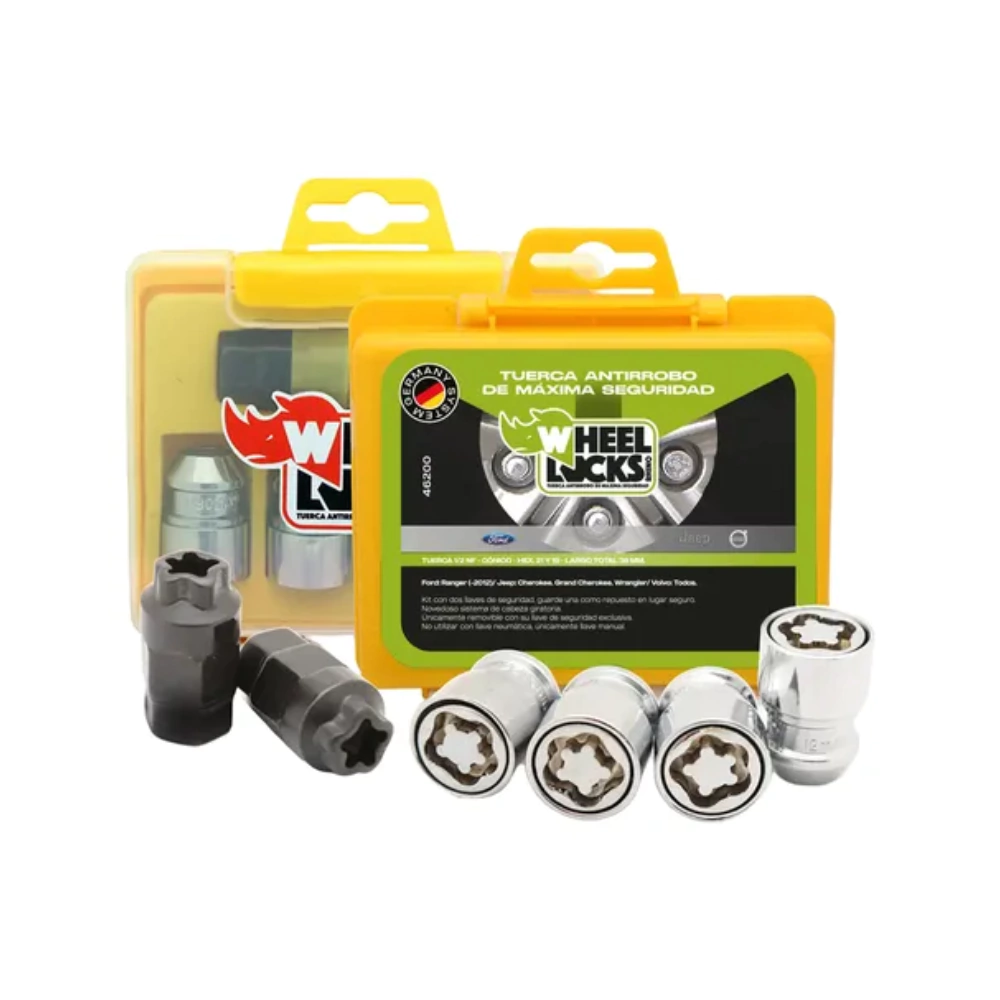 Descripción: Tuercas antirrobo de máxima seguridad con rosca americana (1/2" NF) y asiento cónico, ideales para vehículos que utilizan esta especificación.